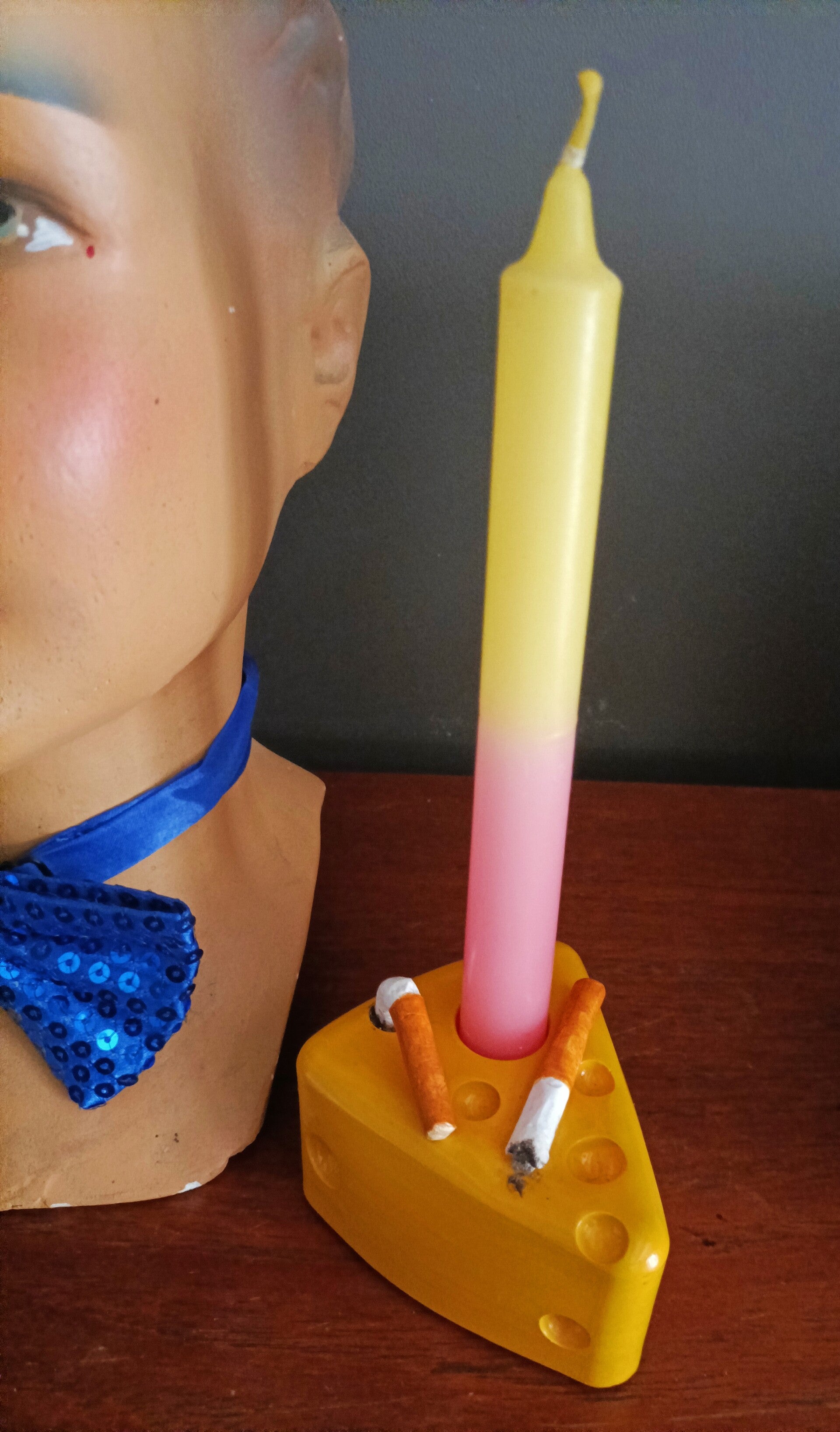 Grappige, handgemaakte kaaskandelaar met uitgeduwde peuken .... net even wat aparter dan een gewoon stukje kaas.
