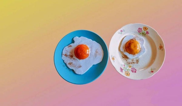 Wandbordje met een spiegelei, natuurlijk met zout en peper.