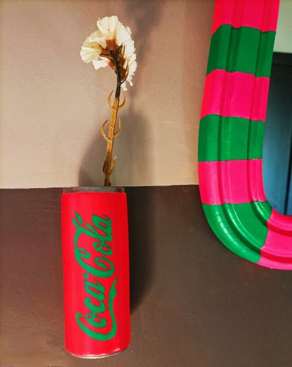Vaasje blikje cola, deze is toch fantastisch voor aan je muur. Je kan er een takje of bloempje in doen.
